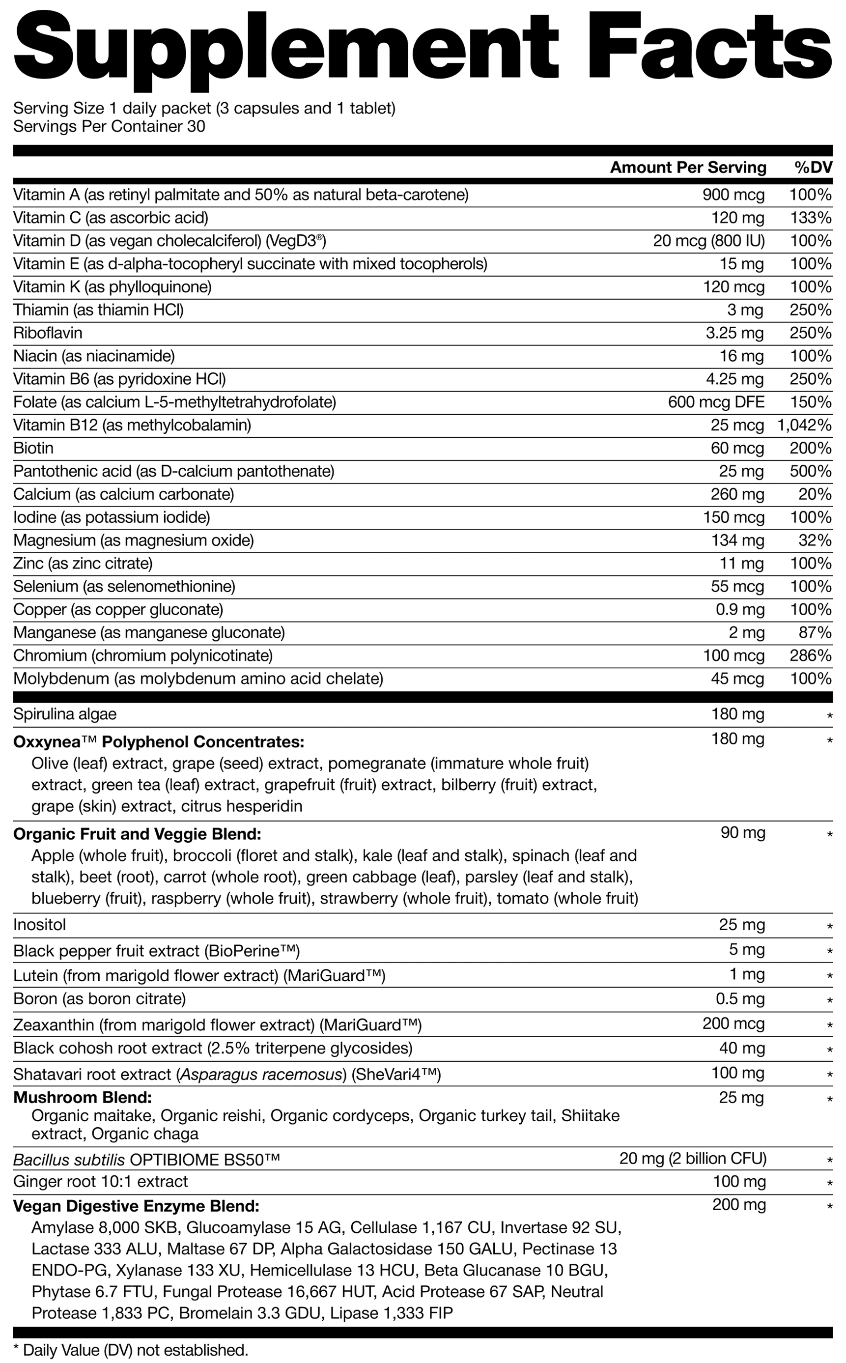 One daily packet of meOrigin® Women's Formula delivers 75 science-backed ingredients — vitamins, minerals, probiotics, enzymes, antioxidants, superfoods, and greens — to help cover daily nutritional needs.*